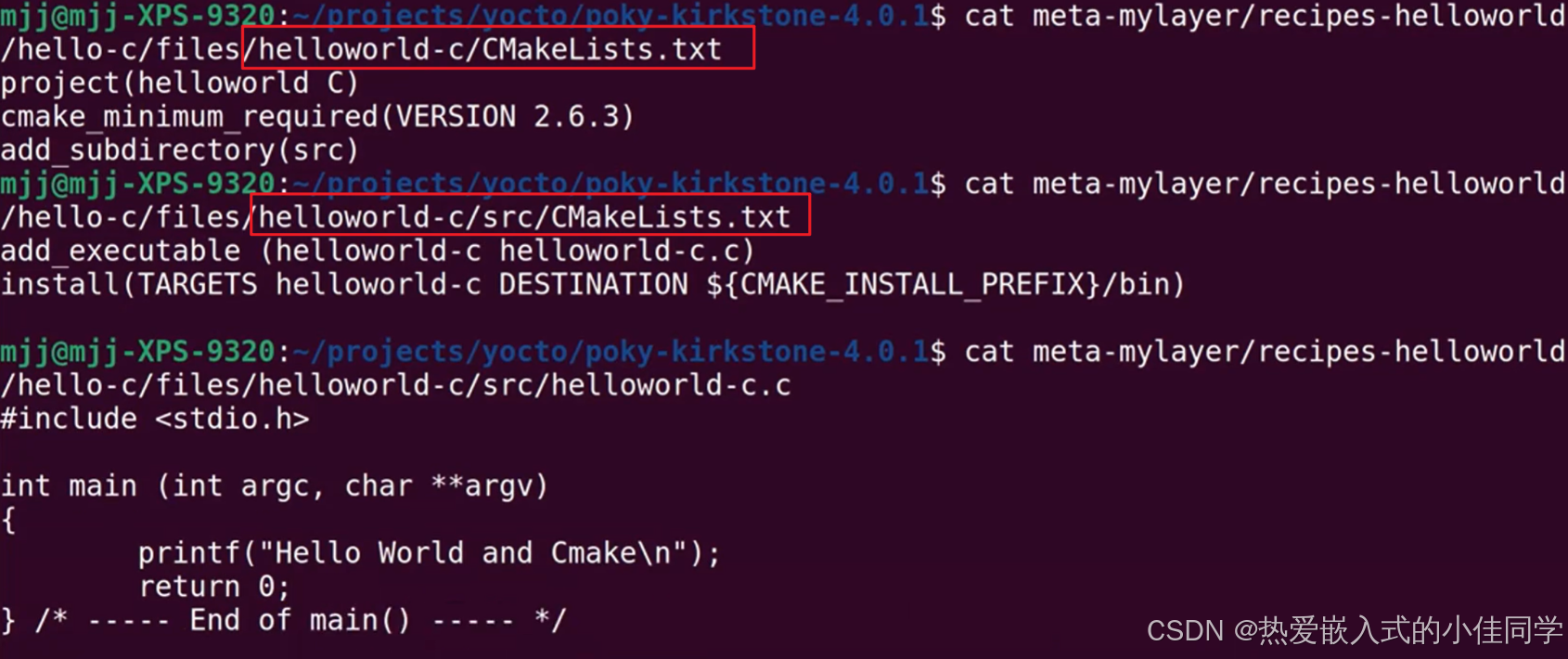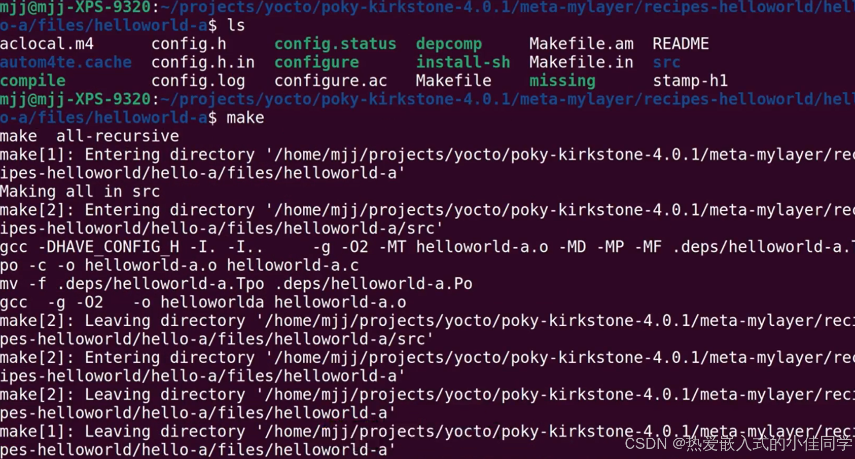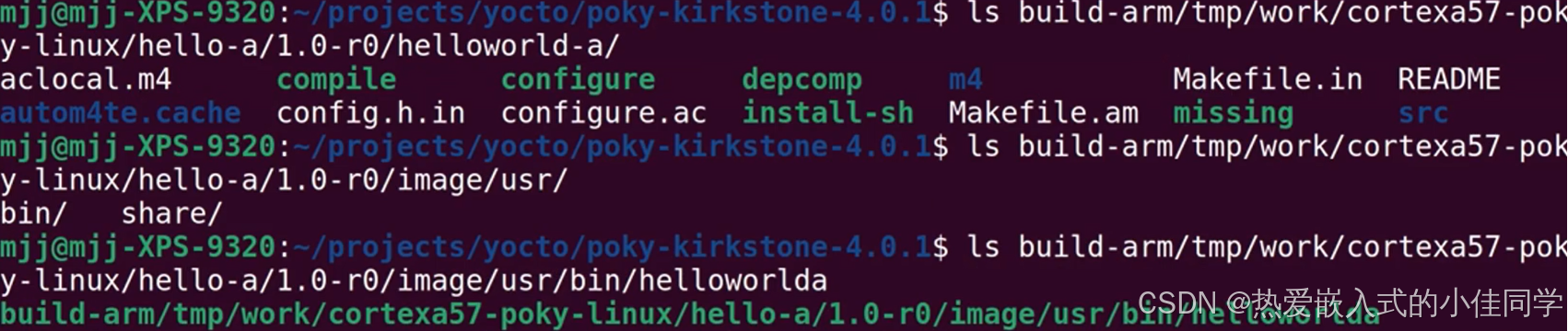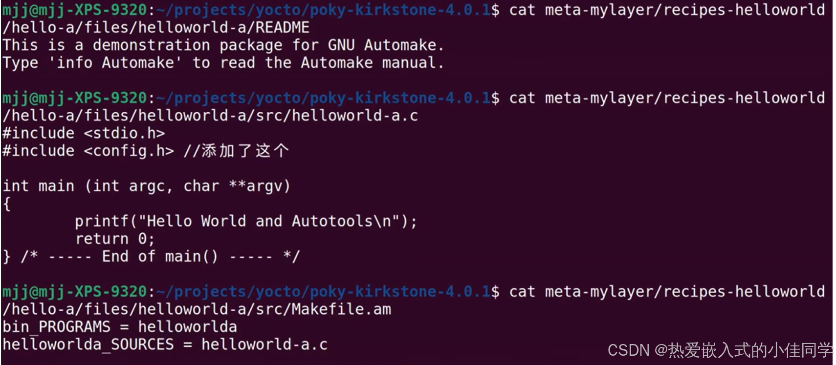 在这里 hello-a 代表基于 configure 编译,hello-c 代表基于 CMake 编译,hello-m 代表基于 Makefile 编译。