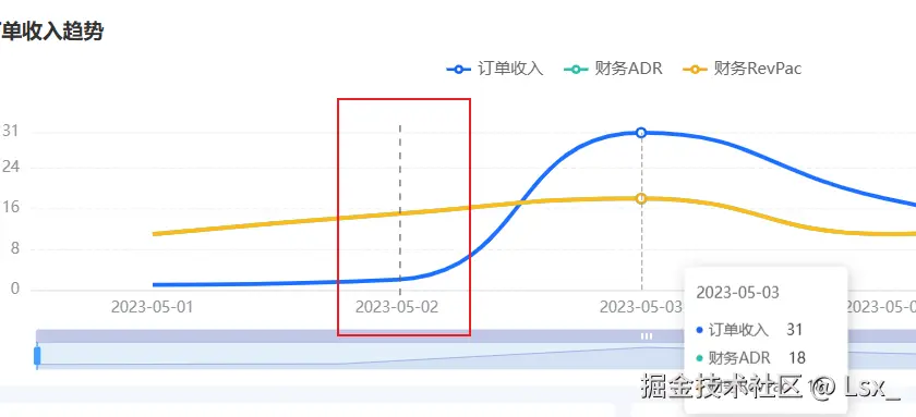 对于折线图,需要支持点击其坐标点左右范围的区间也可触发点击事件,并且点击后要保留竖线。