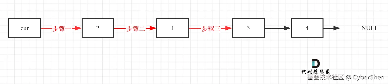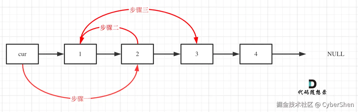 初始时,cur指向虚拟头结点,然后进行如下三步: