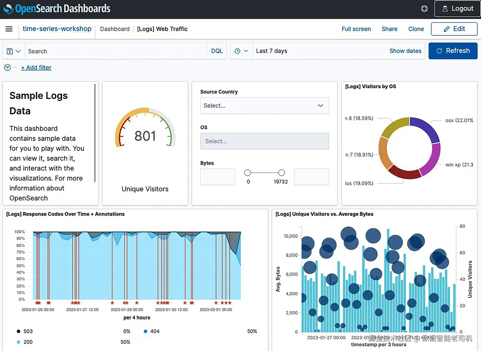 OpenSearch Dashboards (github.com/opensearch-...)是 OpenSearch 项目的一部分,也是开源的数据可视化工具: