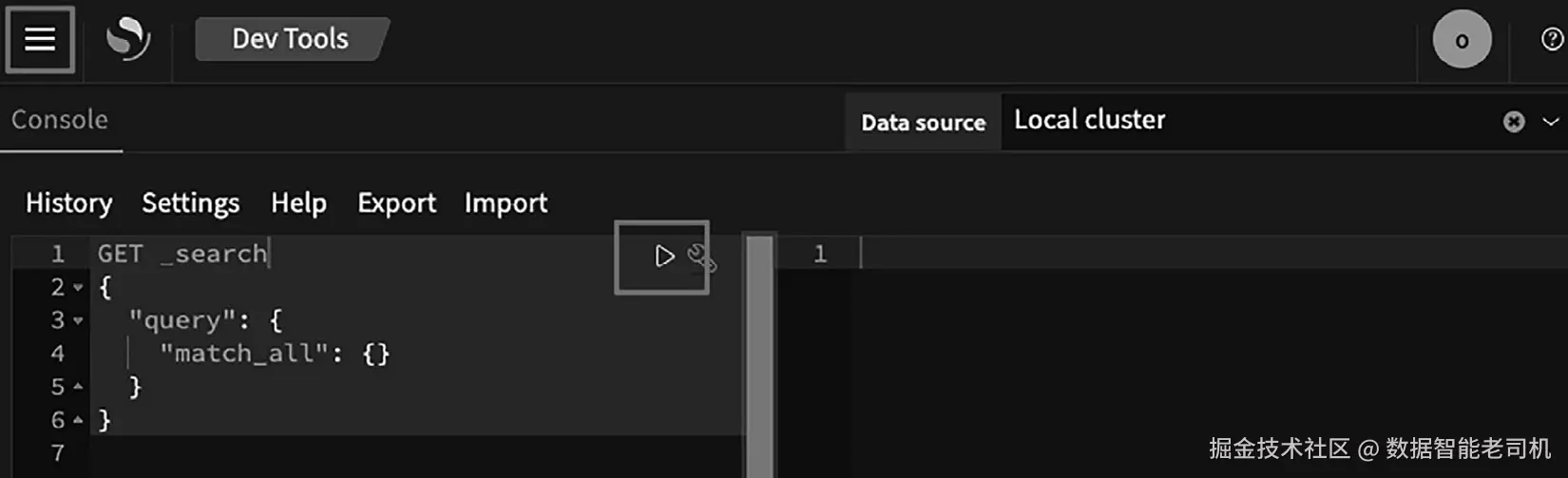 把光标放在这段代码中的任意位置,点击右指向的三角形按钮(见图 1.4)来执行查询。你会在右侧面板看到 OpenSearch 的响应。可以先随意滚动看看,目前不必纠结每个字段的含义。