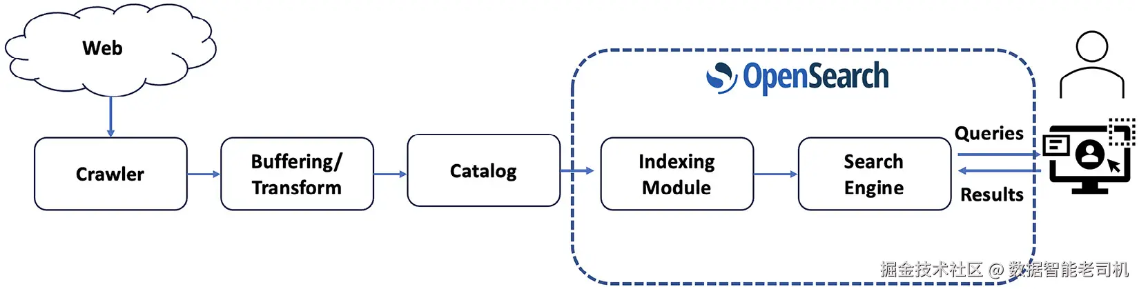 - 索引模块(在图 1.1 中为 OpenSearch 内部模块):接收处理后的数据,构建用于快速查询的优化索引。
