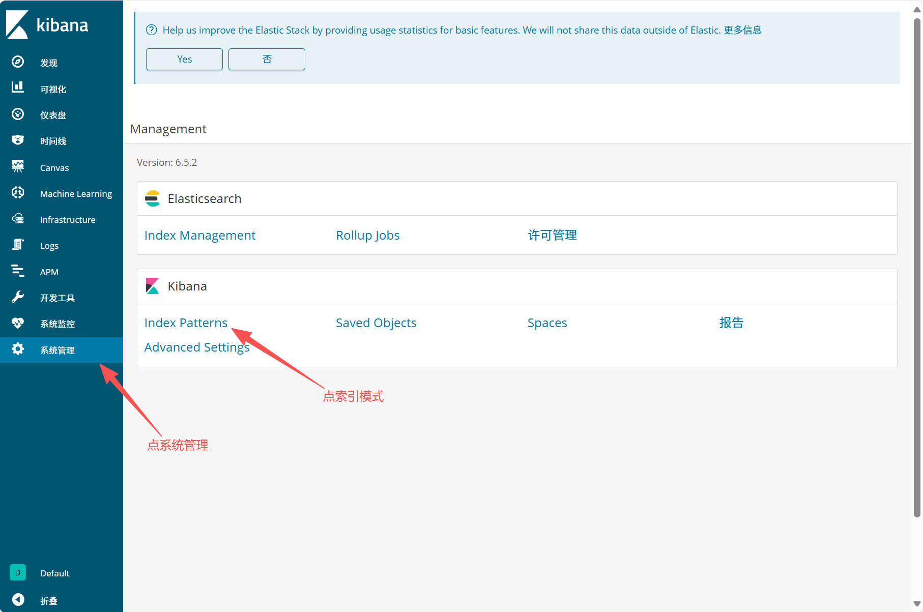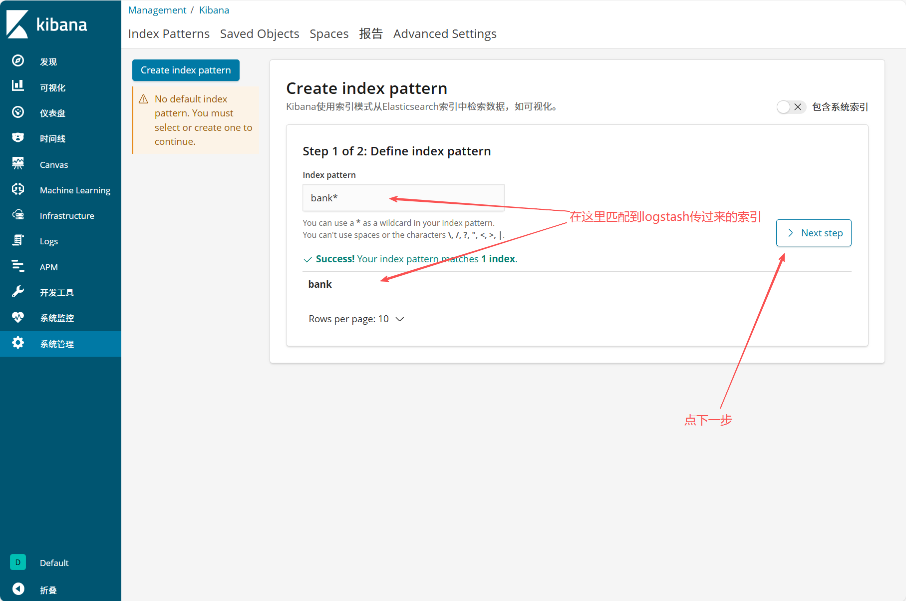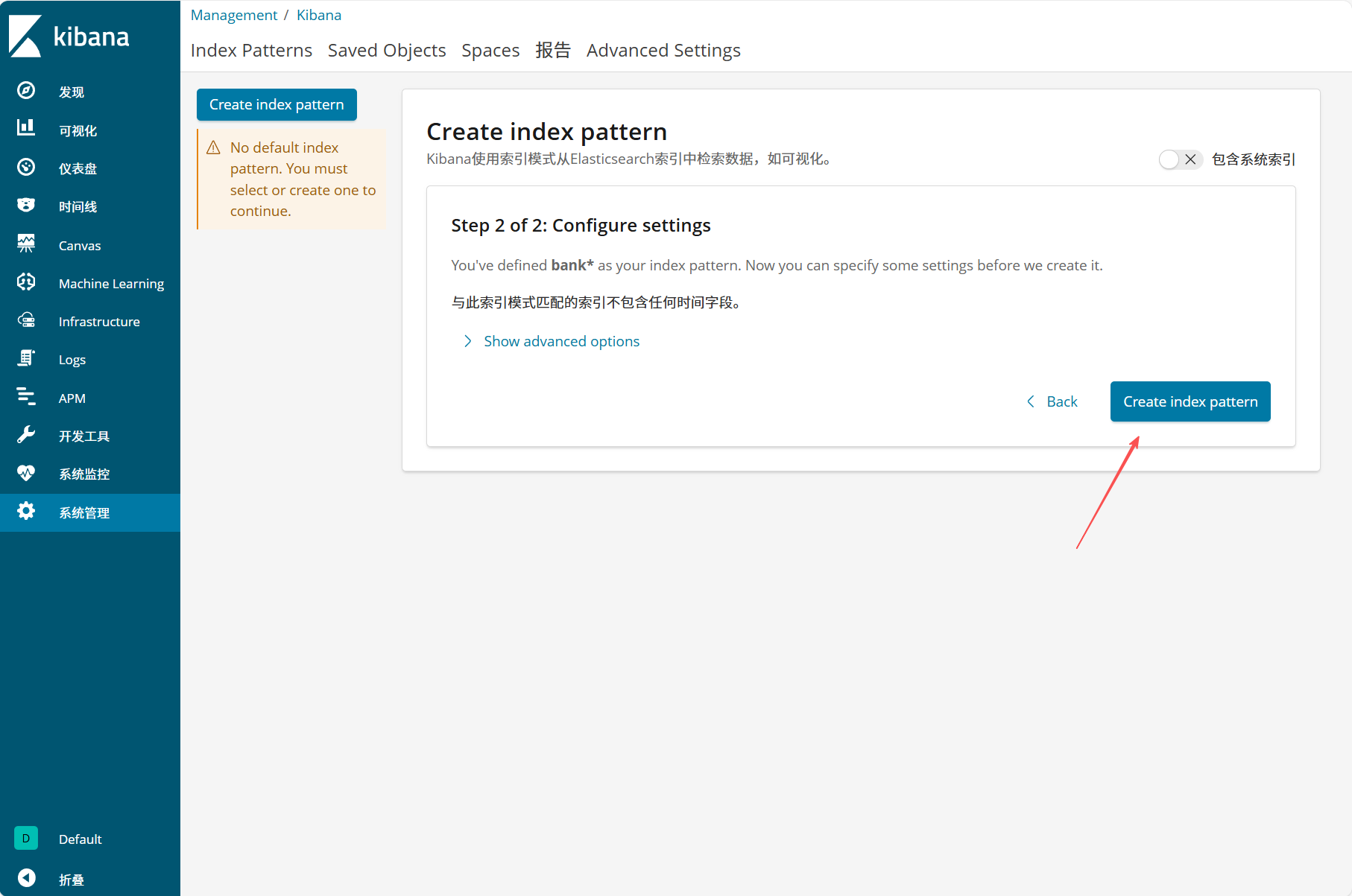 - 点击 "系统管理"→"Kibana"→"索引模式"