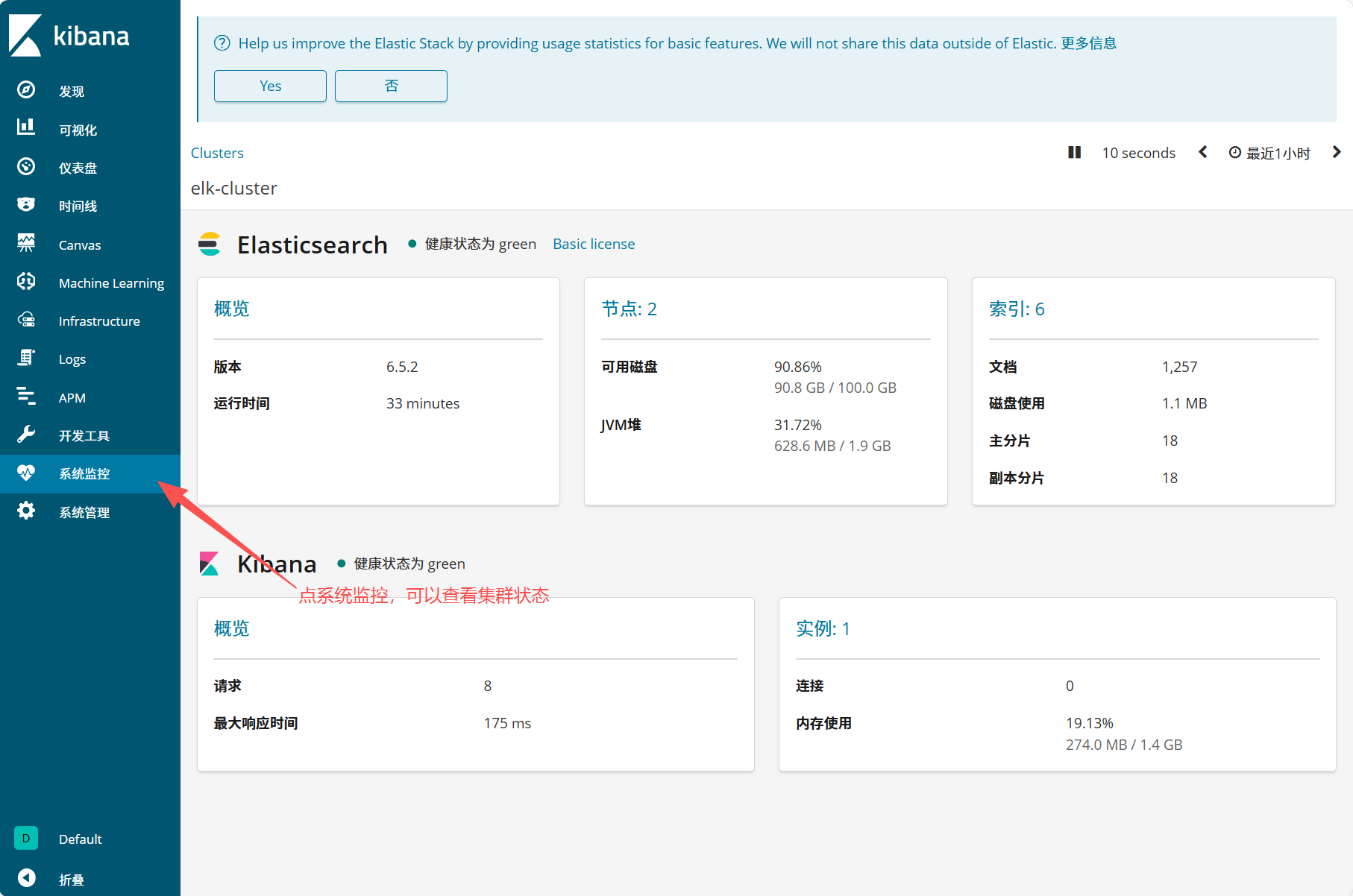 - 进入 Kibana 界面,点击左侧 "系统管理"→"Elasticsearch"→"概览"