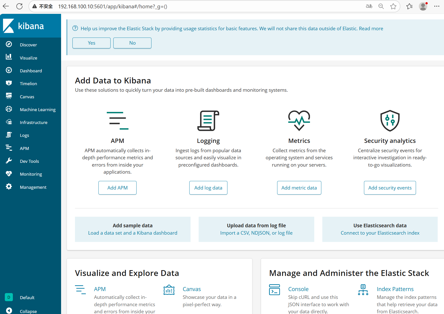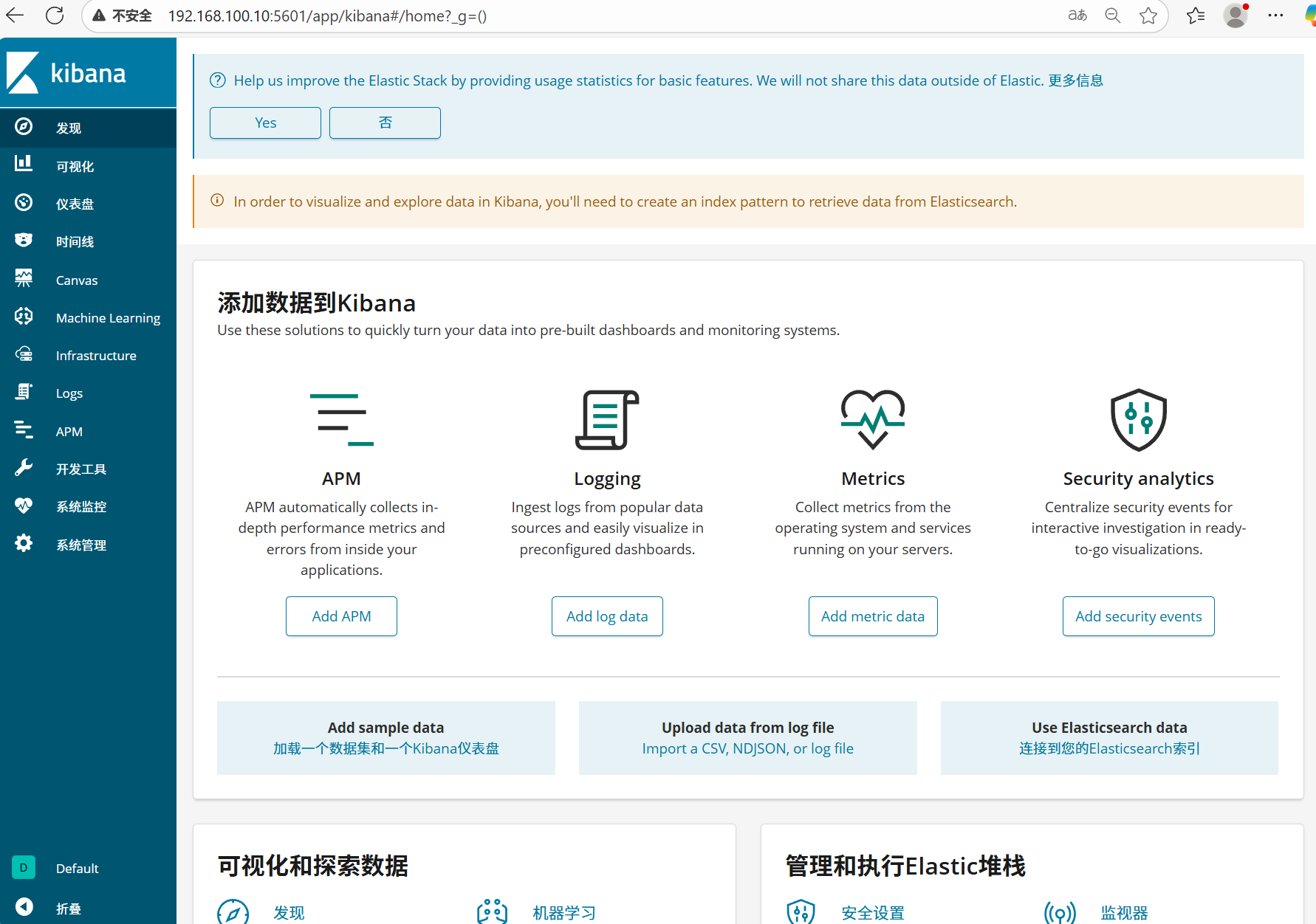 | 4. 访问验证 | 浏览器输入http://Kibana服务器IP:5601,进入 Kibana 首页 |