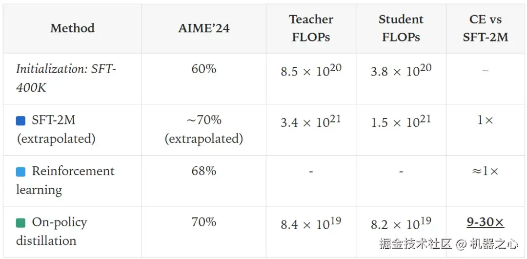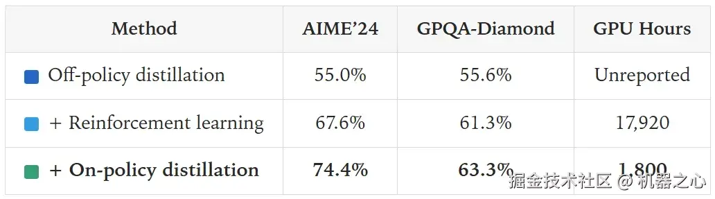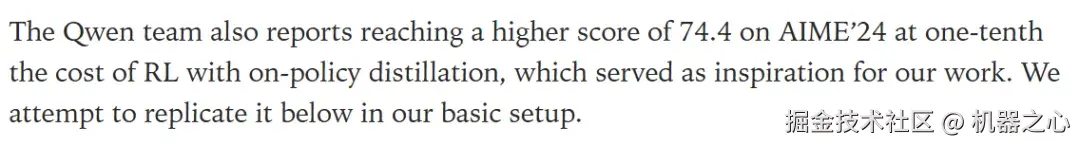 Qwen 团队还报告称,使用在策略蒸馏,能以 RL 成本的十分之一,在 AIME'24 上达到了 74.4% 的更高分数。这也启发了我们的工作。