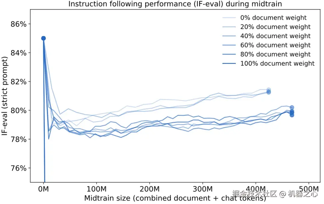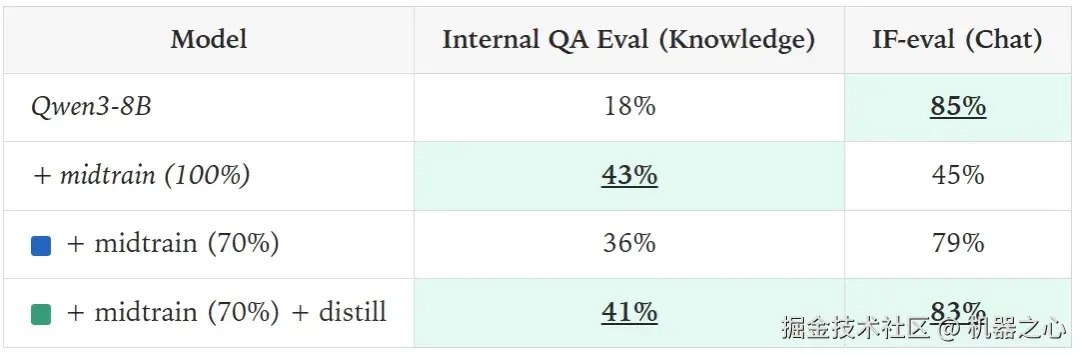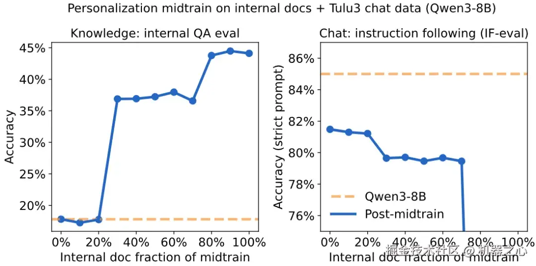 然后,我们在内部文档和聊天数据的不同混合比例上微调 Qwen3-8B。提高文档数据比例会直接提升模型的知识水平。然而,尽管混入至少 30% 的聊天数据有助于保留大部分指令遵循能力,但没有任何一种权重配比能维持在 IF-eval 上的原始性能。