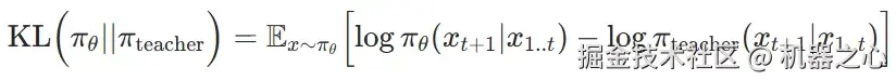 在策略蒸馏可以使用多种损失函数来为学生的轨迹评分。为简单起见,我们选择逐 token 的反向 KL(reverse KL)------ 即在给定相同先前轨迹的条件下,学生(π_θ)和教师(π_teacher)在每个 token 上的分布之间的散度: