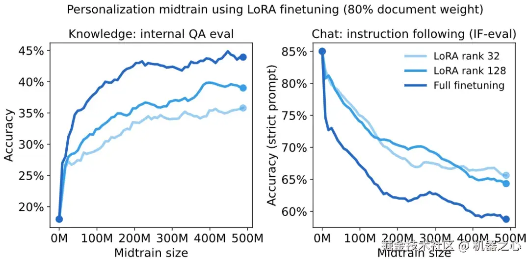 同时训练这两者通常很困难,轻量级微调(如 LoRA)往往不足以实现这一目标,因此需要更大规模的中训练。在掌握新知识的基础上学习后训练行为,需要一个复杂的后训练堆栈,通常由专有数据和奖励模型组成。虽然前沿实验室可以做到这一点,但其他从业者要复刻可能很困难或成本高昂。