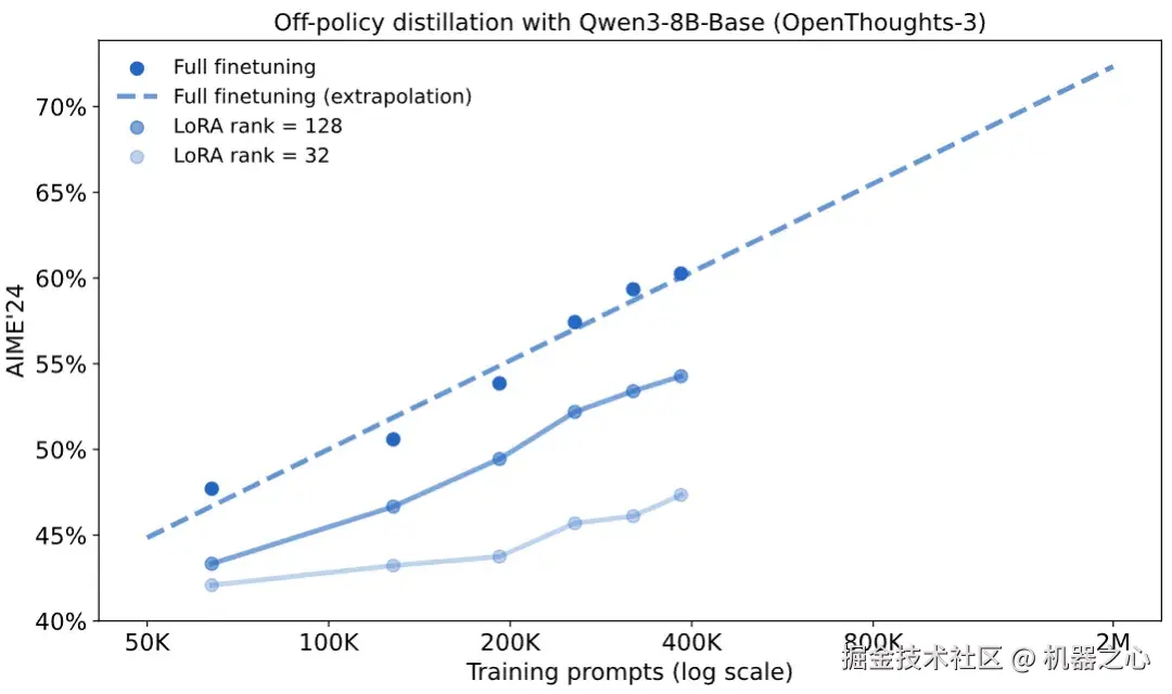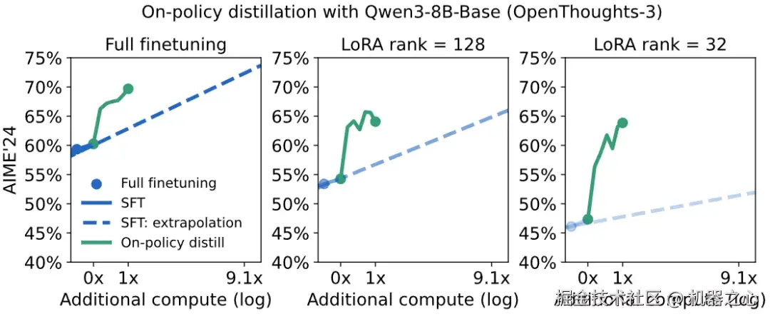 在 40 万个提示上对学生模型(Qwen3-8B-Base)进行全参数微调(full fine-tuning),在 AIME'24(一个数学问题基准测试)上获得了 60% 的分数。我们也可以使用 LoRA 进行训练,但在高容量数据集上训练时,它落后于全参数微调。在所有情况下,我们都看到性能呈对数线性增长 ------ 最初的性能提升很廉价,但后期的提升成本高昂。