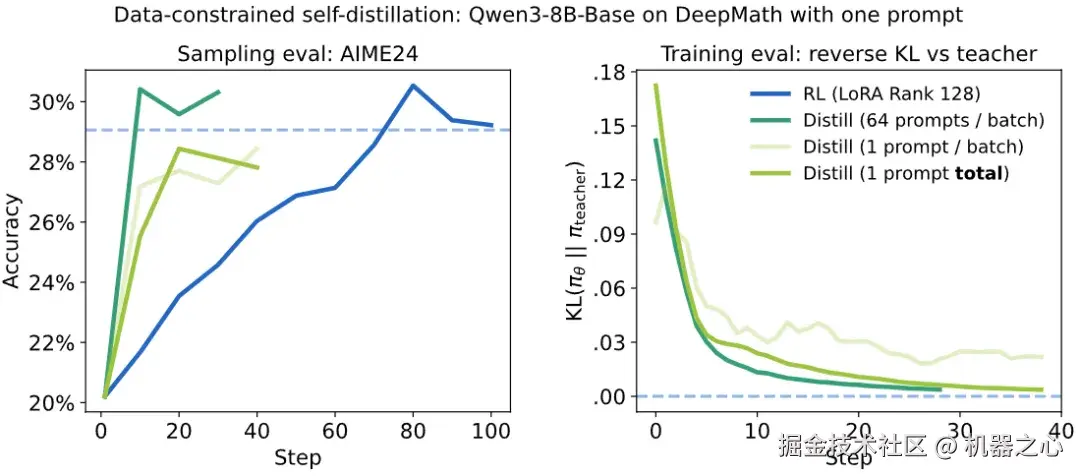 我们重复了上述在数学上训练 Qwen3-8B-Base 的实验,但这次只使用数据集中随机选择的一个提示。我们在这个提示上连续训练了 20 步。尽管我们只在一个提示上训练,但我们确实达到了与教师模型相当的性能。
