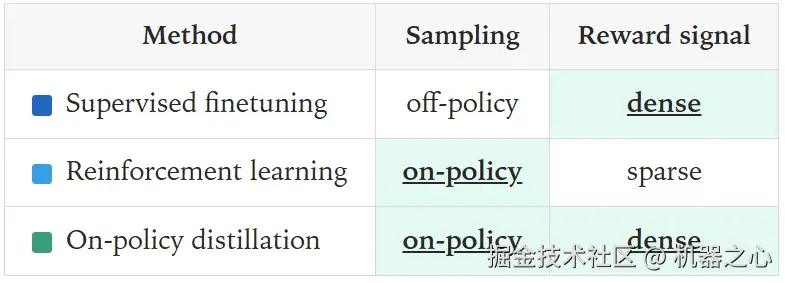 强化学习和在策略蒸馏都通过反向 KL 进行学习,修剪基础策略中存在的动作空间。区别在于奖励的密度。