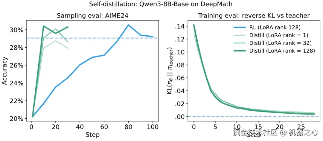 在 DeepMath 上运行 RL。我们使用 128 的 LoRA rank。生成的模型是蒸馏的教师。