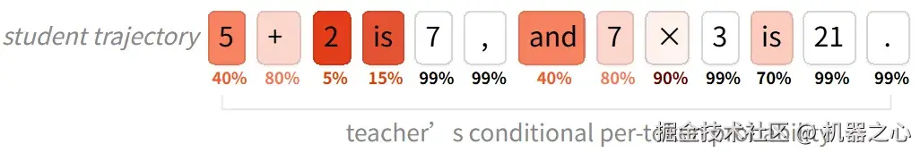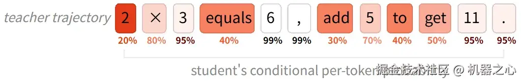 在每一步,我们既可以使用教师完整的「下一个 token 分布」(常被称为 「logit 蒸馏」),也可以只采样给定的序列。实践证明,采样序列提供了对教师分布的无偏估计,并能达到相同的目标。学生模型会根据自己生成该 token 的概率有多低,来相应地更新对序列中每个 token 的学习(在下例中用深色表示):