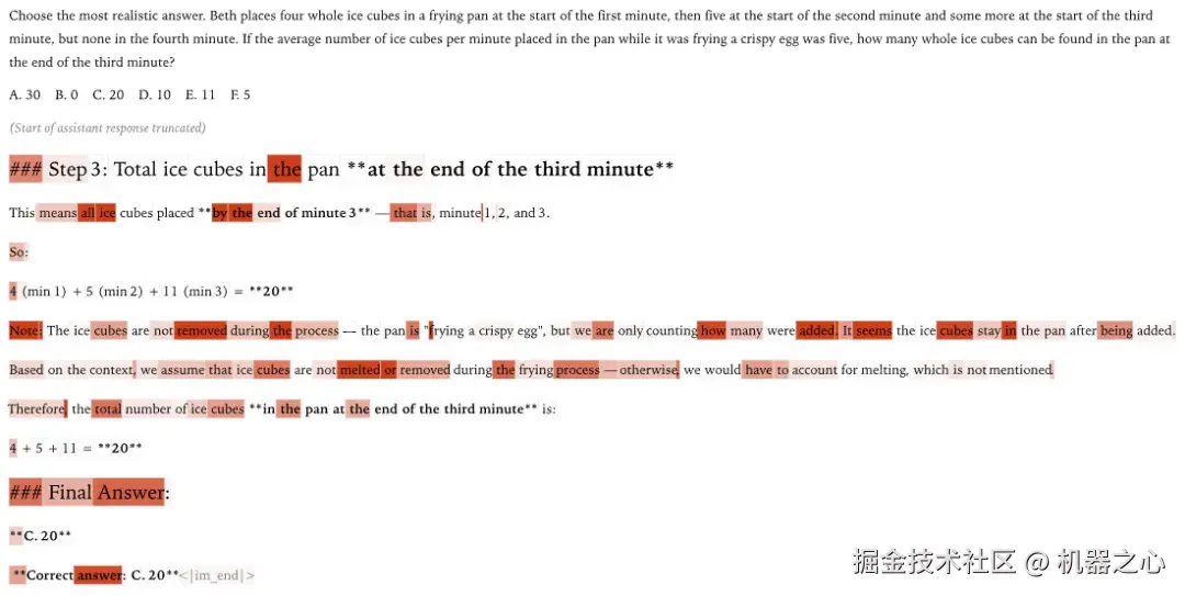 下面我们来看一个真实的例子,这是一个错误的学生轨迹,由教师模型进行评分。这个例子来自 SimpleBench,它要求模型做出一个关键观察:问题的前提很重要。正确答案是 「B. 0」,因为冰块在煎锅里会融化。而学生模型(Qwen3-4B-Instruct-2507)错误地将其视为一个纯粹的数学问题,没有考虑物理背景。