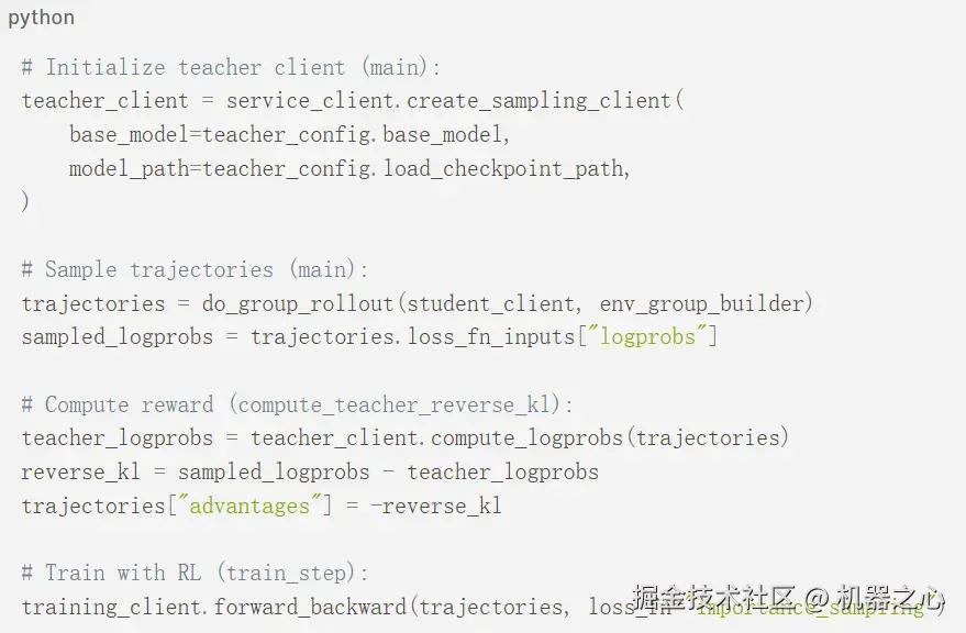 计算奖励:我们用 compute_logprobs 函数在采样出的轨迹上查询教师客户端,它会返回教师在学生采样的 token x 上的对数概率 log π_teacher (x)。然后我们用这个来计算反向 KL。
