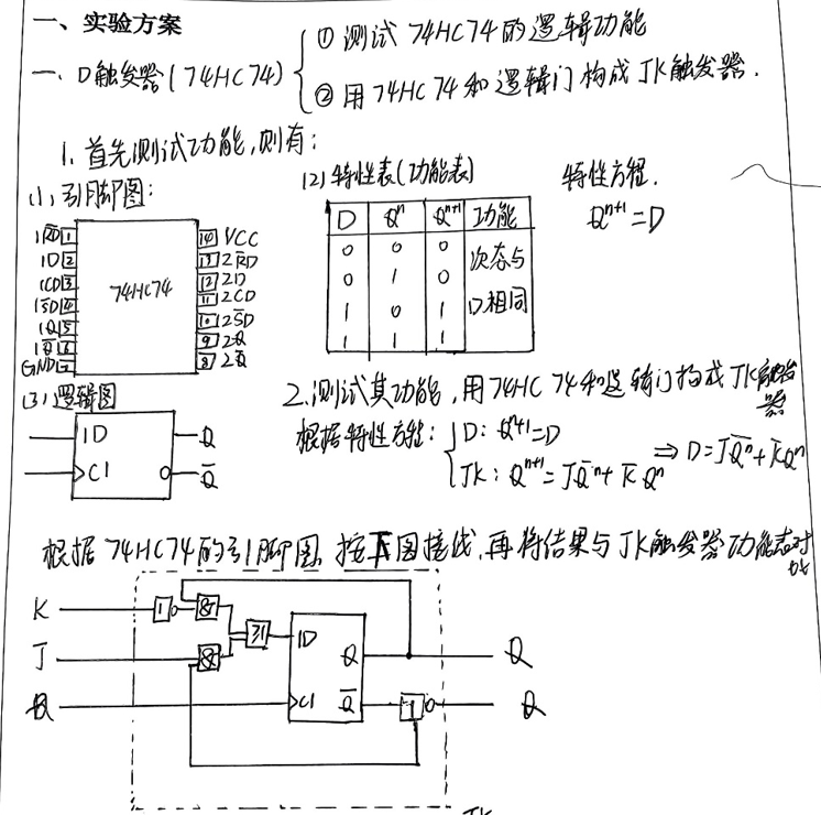 - 用 74HC74(双D触发器):先测试D触发器功能,再通过逻辑门把它改成JK触发器;