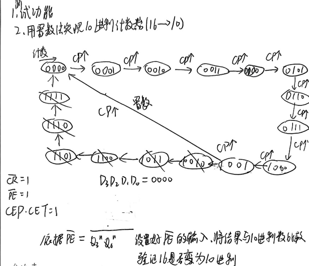 - 10进制计数范围是0-9(二进制0000-1001),当计数到10(1010)时,让CR=0(清零),所以需要把Q3(8)和Q1(2)通过与非门接CR(因为1010时Q3=1、Q1=1,与非后为0,触发清零)。