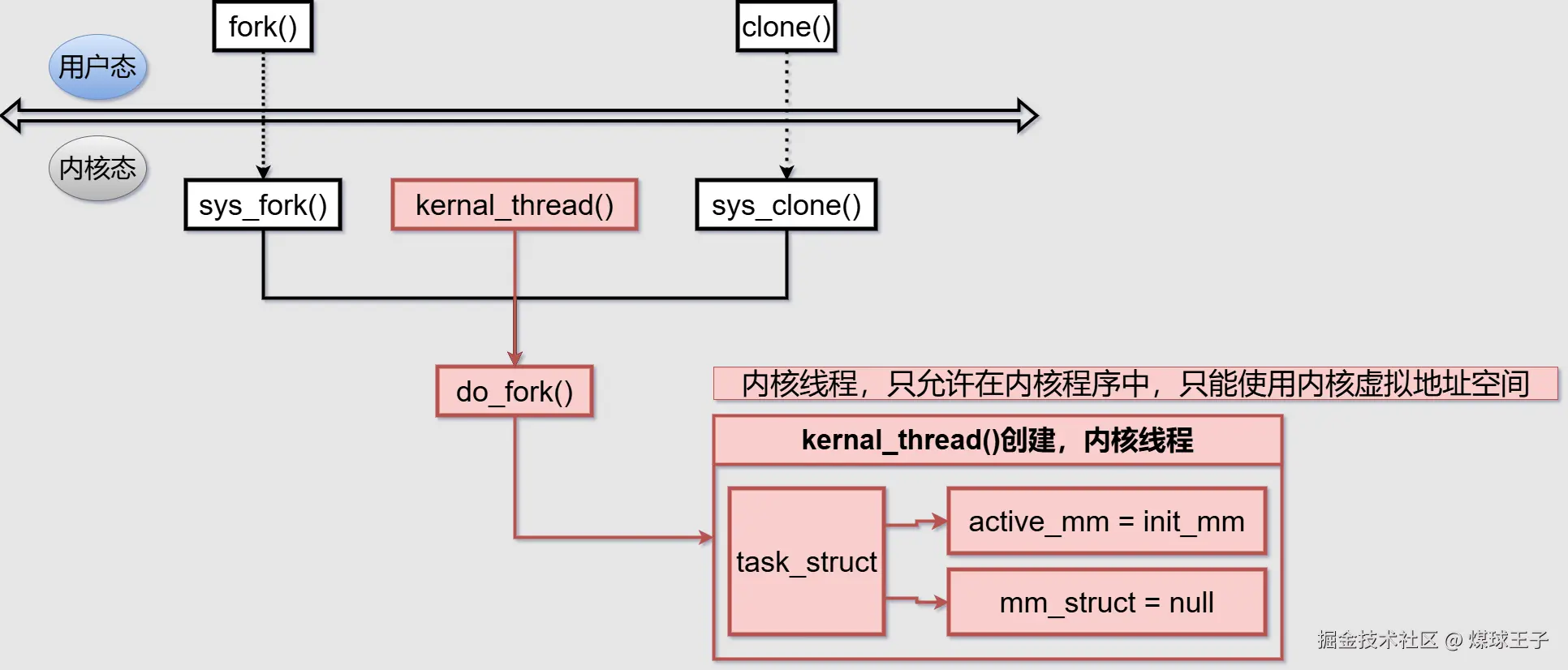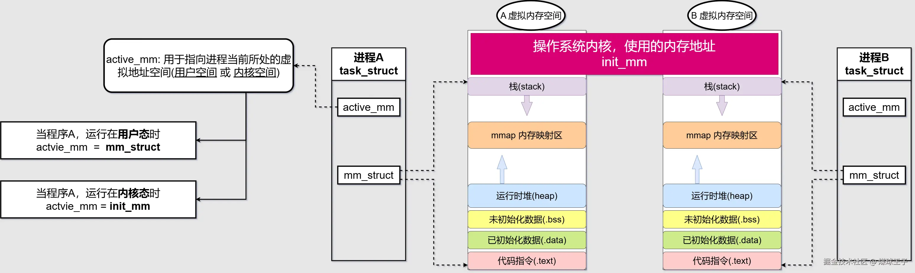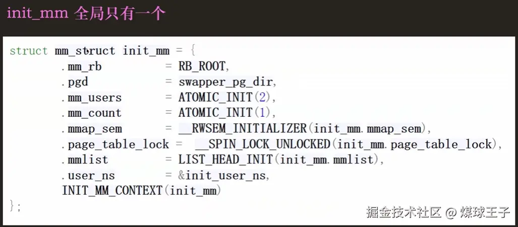 内核启动的时候,初始化init_mm, 它全局只有一个,管理内核程序虚拟地址空间