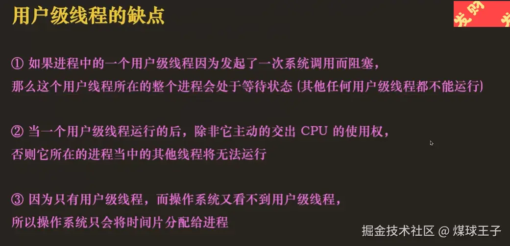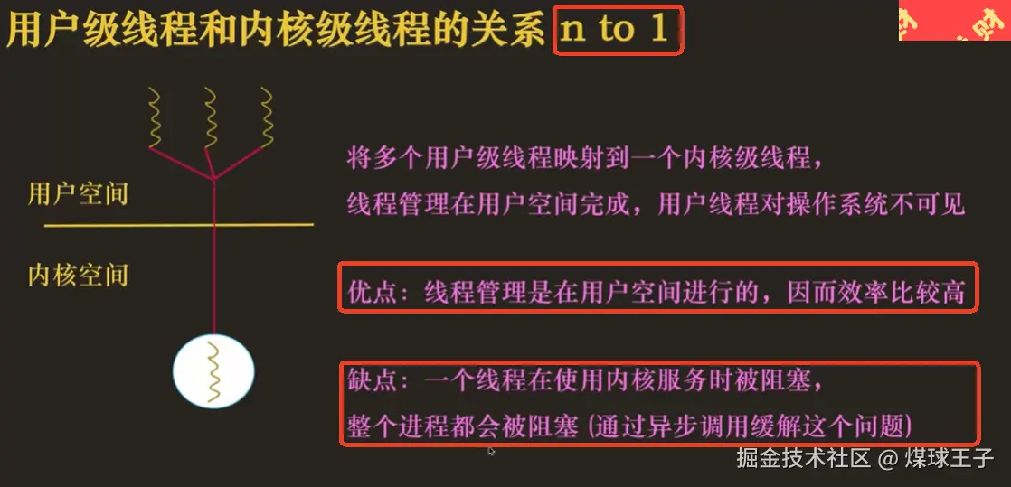 用户级线程:在用户空间实现的线程,操作系统内核看不到的线程(线程的TCB存放在用户空间的,操作系统内核它只能看到进程_PCB, 操作系统只能以进程为单位来调度) ---------》用户级线程是由一些应用程序中的线程库()来实现,应用程序可以调用"线程库"的API来完成线程的创建、线程的结束、等操作
