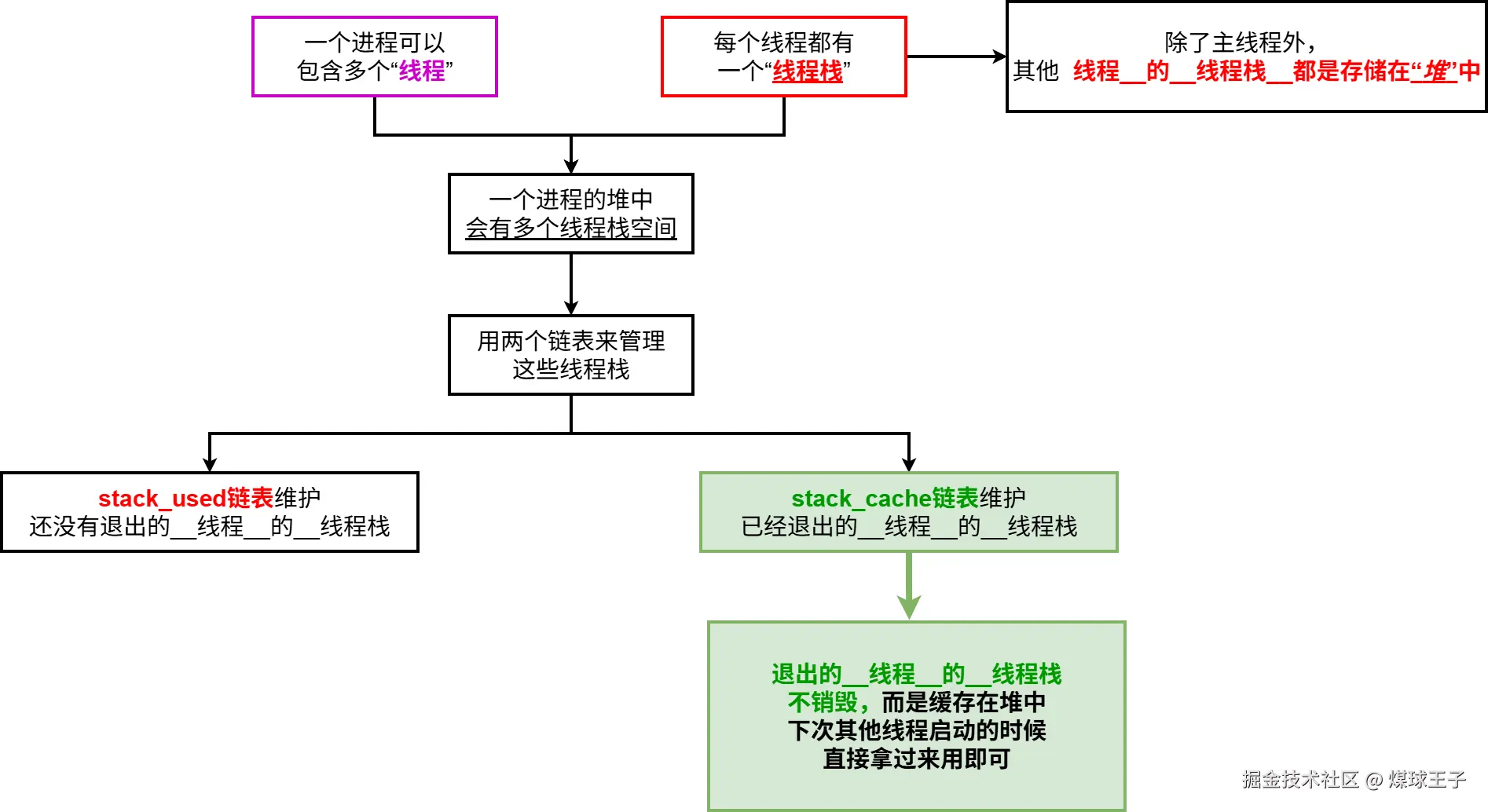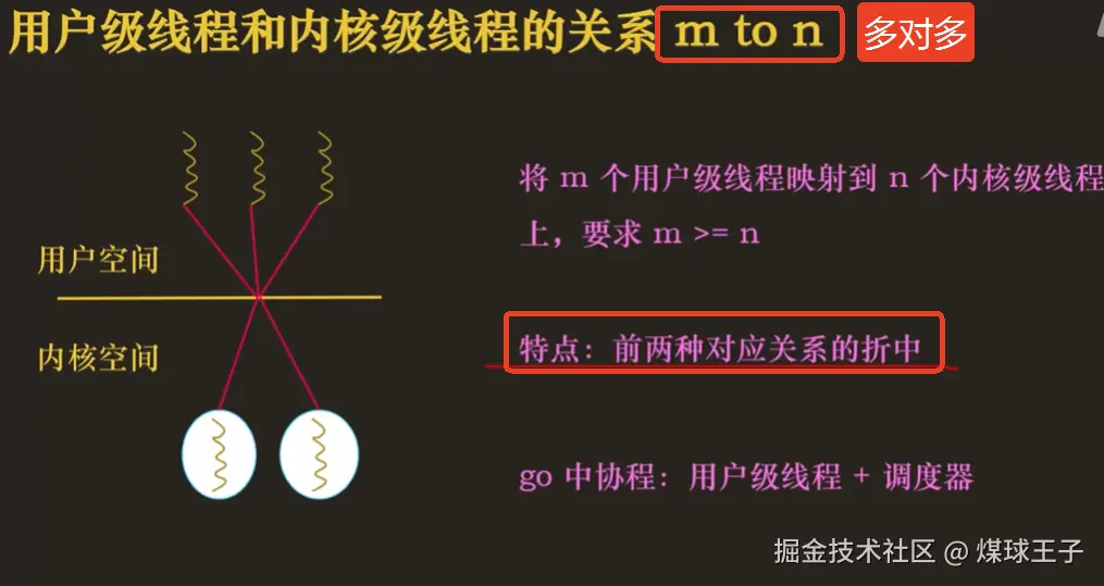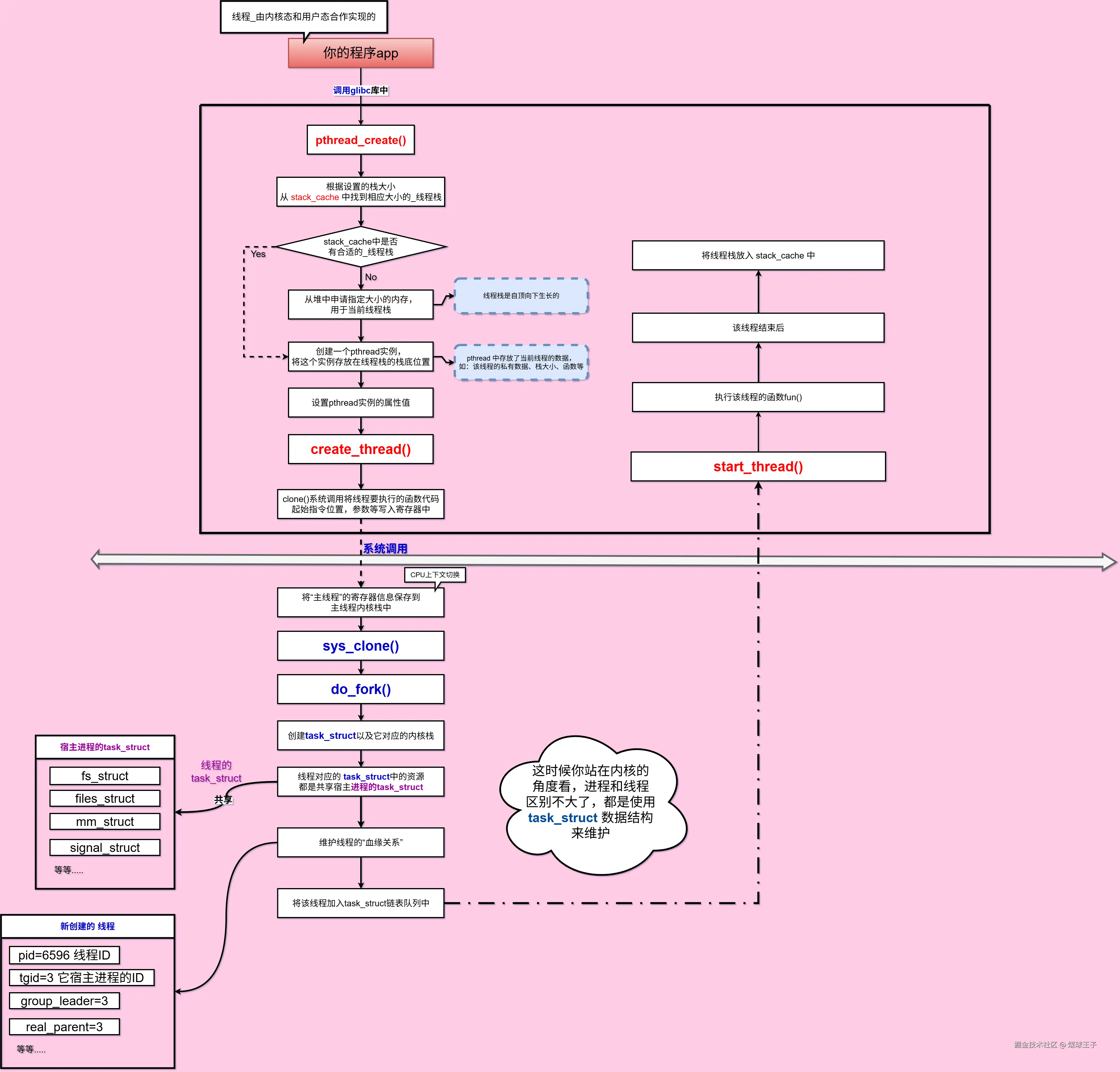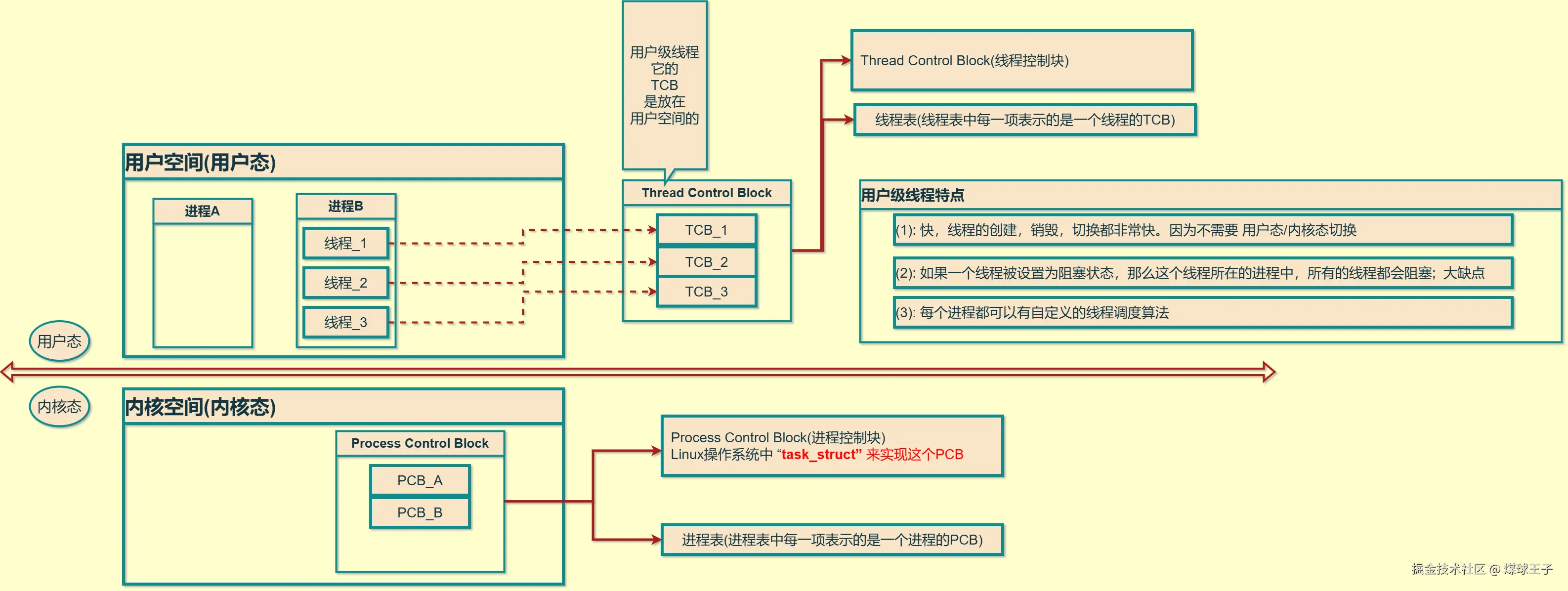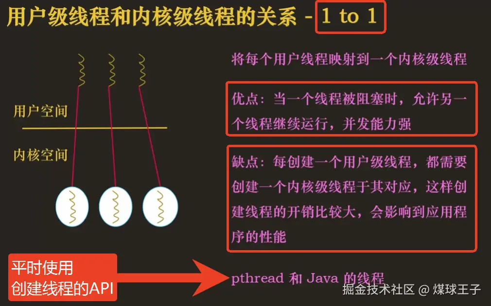 | 用户态直接创建并维护 | 用户态发起创建--->透过--->系统调用--->内核态真正新建线程 |