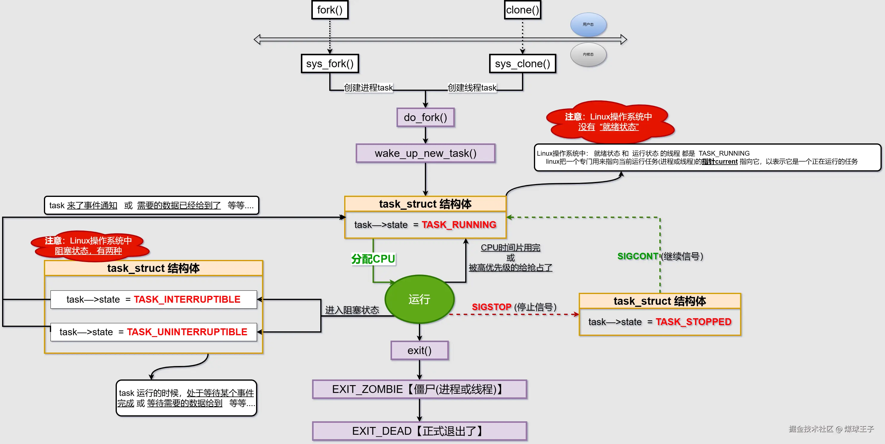 注意:linux中的线程,没有就绪状态(在linux中,就绪状态和运行状态的线程都是 "TASK_RUNNING", 但是linux搞了一个专门用来指向当前运行任务的指针current 指向它,以表示它是一个正在运行的线程)