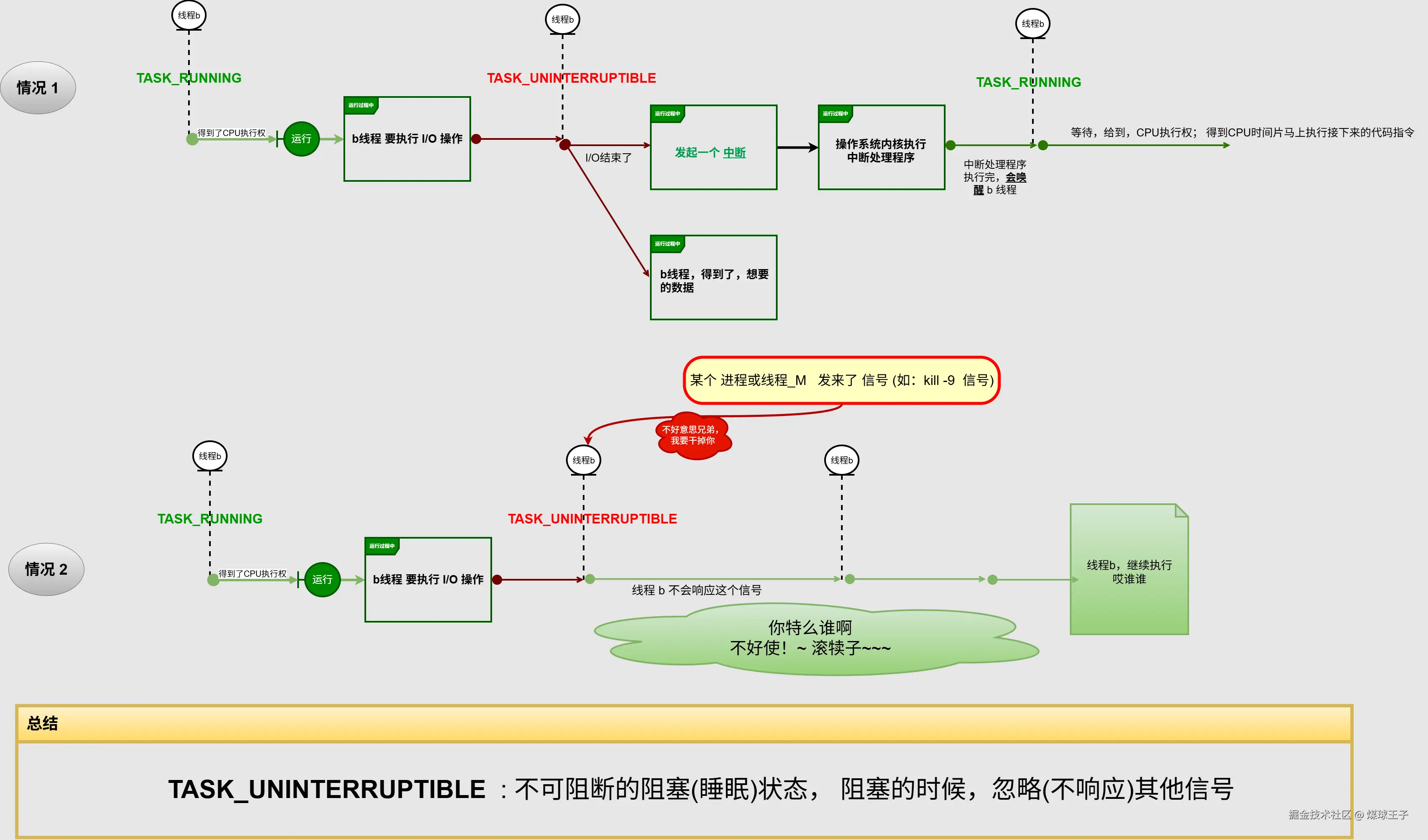 理解这些状态对看BUG问题很有帮助。比如,偶尔看到 D 状态通常是正常的,但如果多个线程长时间处于 D 状态,可能意味着某些硬件(如磁盘)或驱动出现了问题。而大量的 Z 状态线程则会消耗系统进程号资源,是需要避免的"僵尸线程"。