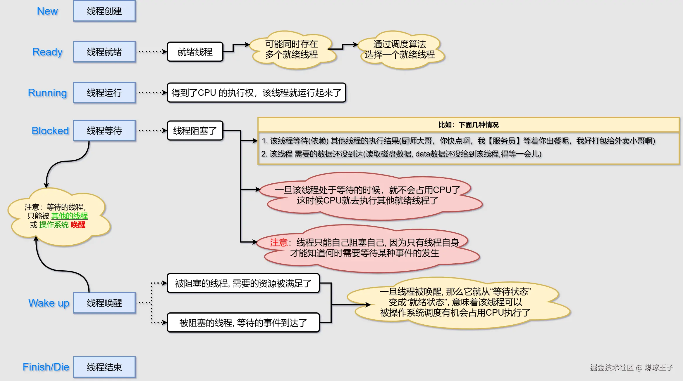 I/O 操作 是导致线程阻塞最常见和典型的场景之一,无论是磁盘 I/O 还是网络 I/O。 除了 I/O,线程阻塞(或进入非运行状态)的场景还有很多。我们可以从操作系统调度和线程生命周期的角度来系统地理解它们。
