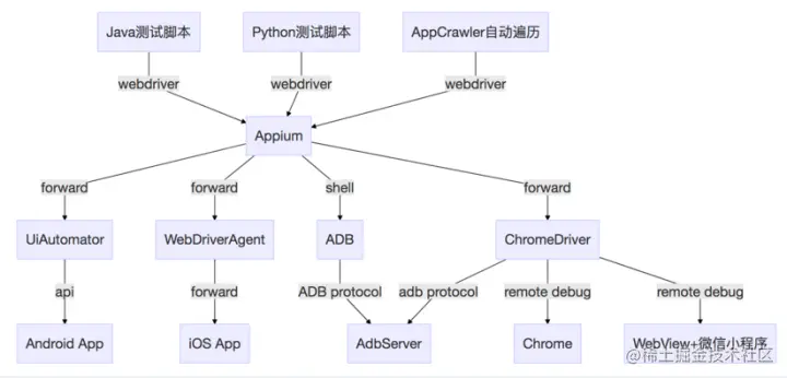 - ChromeDriver 可以用来直接与 AdbServer 进行通讯,也可以远程调试 Chrome、WebView 及微信小程序