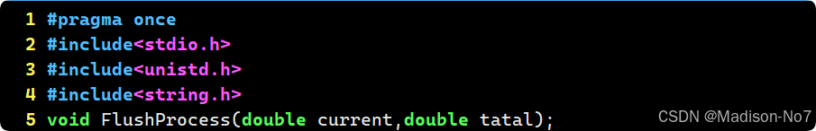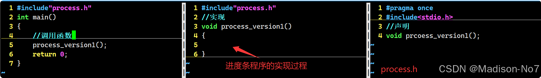 process.h头文件,用于对进度条函数的声明,以及包含函数实现所需的头文件。process.c源文件,在里面定义进度条函数的实现。main.c源文件,用于调用进度条函数。