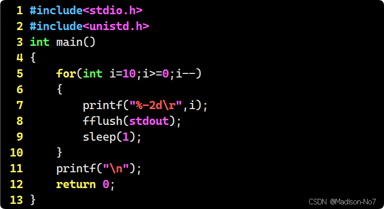 因为\r不能刷新缓冲区,只起到回车的作用,所以要用fflush函数刷新缓冲区。%-2d是让打印出的数字的宽度为2,左对齐。最后程序结束前还要打印\n,是因为最后想保留数字0,否则就会被覆盖掉。