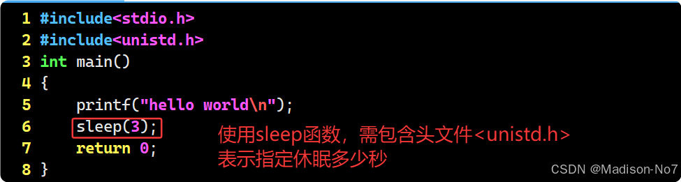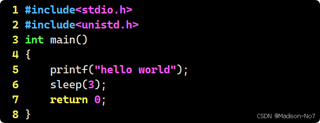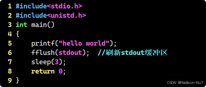 大家可以看到是先休眠三秒,在打印出hello world,最后程序退出。按理来说,程序自上往下按顺序执行代码,也就是说一定是把printf执行完了,再去执行sleep,那printf执行完了,显示器并没有显示出来,那么在休眠3秒期间,"hello world"在哪里?答案是在缓冲区里面,printf函数底层是把格式化的数据写入到stdout缓冲区,然后stdout缓冲区刷新,就会被将数据写入到内核空间,最终硬件输出到屏幕。
