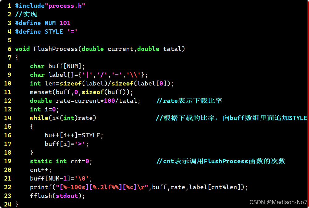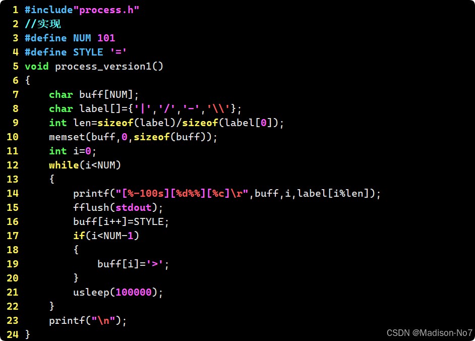 进度条向右走动的原理就是,这一次比上一次多打印一点内容。因此我们可以定义一个字符数组 buff,通过循环每次往字符数组里面追加字符,然后将这个字符数组打印出来,由于每次循环都会往数组里追加字符,所以就会导致下一次打印出来的内容比这一次的多,视觉上就感觉进度条在往右走。又因为进度条始终是在同一行往右走的,所以每打印完一次要用\r,是为了让光标回到当前行的最开始位置,下一次打印就会产生覆盖的效果,紧接着要对 stdout缓冲区刷新,我们才能看到字符显示出来。
