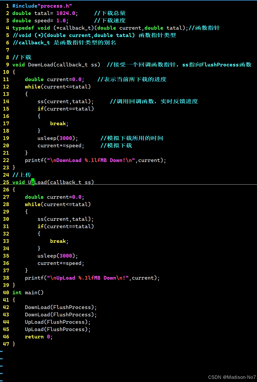 现实中的进度条,往往出现在下载一个东西的时候,用进度条来显示下载的进度。但是进度条本身并不知道下载了多少,它只会提供一个接口,在下载东西的时候,调用这个接口,然后将已经下载好的比率作为参数传给进度条函数,它会根据比率打印出对应的进度条进度。