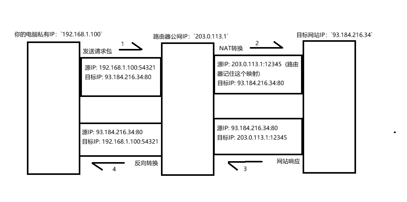 源IP: 203.0.113.1:12345 (路由器记住这个映射)
