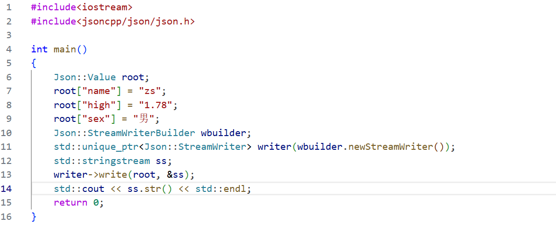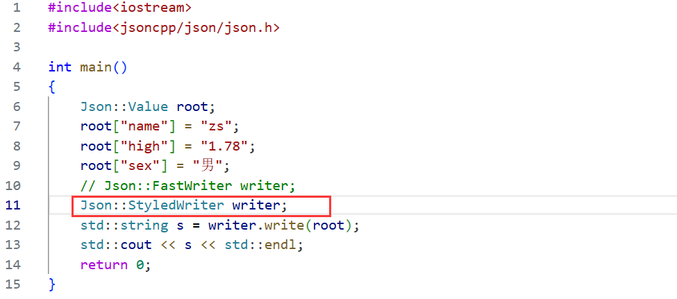第二种方法 :StreamWriter是一个抽象类,StreamWriterBuilder是一个独立的类,newStreamWriter是它的一个函数,用来创建StreamWriter子类的对象,用来初始化对象,write函数是将Json::Value对象的内容可以写到流对象中的。