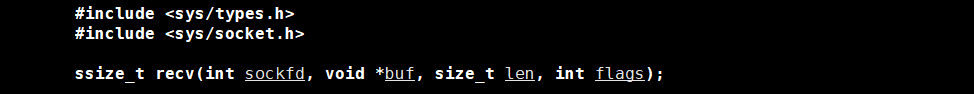 sockfd是文件描述符,buf是用户自定义缓冲区,len是缓冲区的大小,flags标志位,0默认行为代表阻塞,MSG_DONTWAIT代表非阻塞操作。
