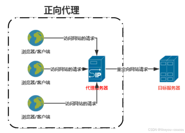 正向代理服务的特点是代理服务器 代理的对象是浏览器/客户端,也就是对于目标服务器 来说浏览器/客户端是隐藏的。