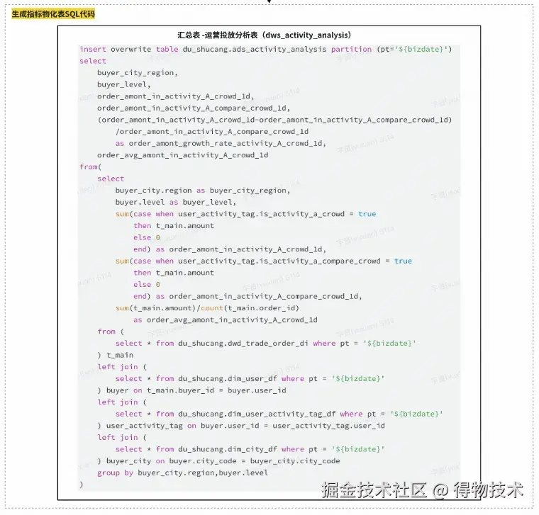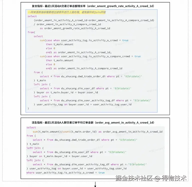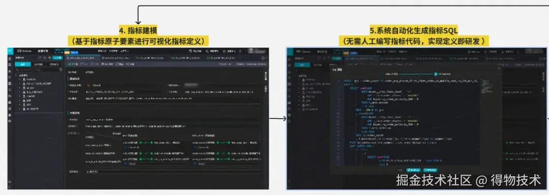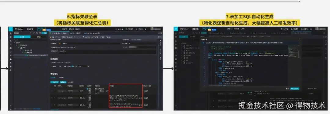 从上图我们也可以看到,原子口径的变更影响非常大,即使可以基于血缘进行变更握手管控,人工修改逻辑也容易改错或遗留。因此我们实现了自动化指标代码生成的能力,基于原子口径自动化生成指标及其物化表的加工逻辑。