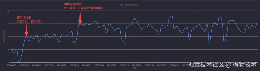 其中高活用户的智能代码续写功能开启率为98.5%,整体采纳率趋势和我们做的优化动作如下: