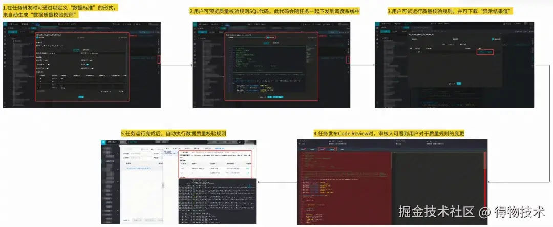 Galaxy数据研发平台已经实现了完善的数据质量规则校验能力,用户在Galaxy数据研发IDE上面向数据标准 进行高效的质量规则定义,系统会自动生成校验SQL随着任务的发布一起下发到调度系统中执行。同时支持了强规则(主路执行,数据异常阻断任务执行)和弱规则(旁路执行,数据异常进行告警) 两种规则运行场景,应对不同的场景诉求。产品效果如下所示: