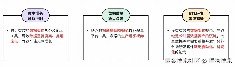 过去整套大数据基础设施我们都使用云上商业化产品(下文简称"云平台"),但在各方面已远无法匹配上得物长期的业务发展。目前得物大数据面临着如下挑战: