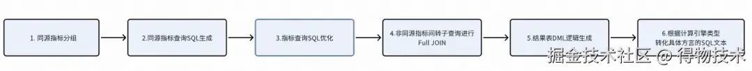 将指标按来源表分组,并将其的组成原子要素(原子指标+业务限定+统计周期+统计粒度)进行SQL逻辑的组装、优化、方言翻译,具体流程为: