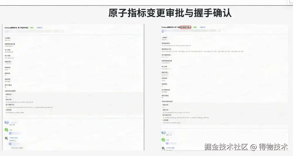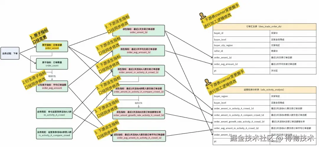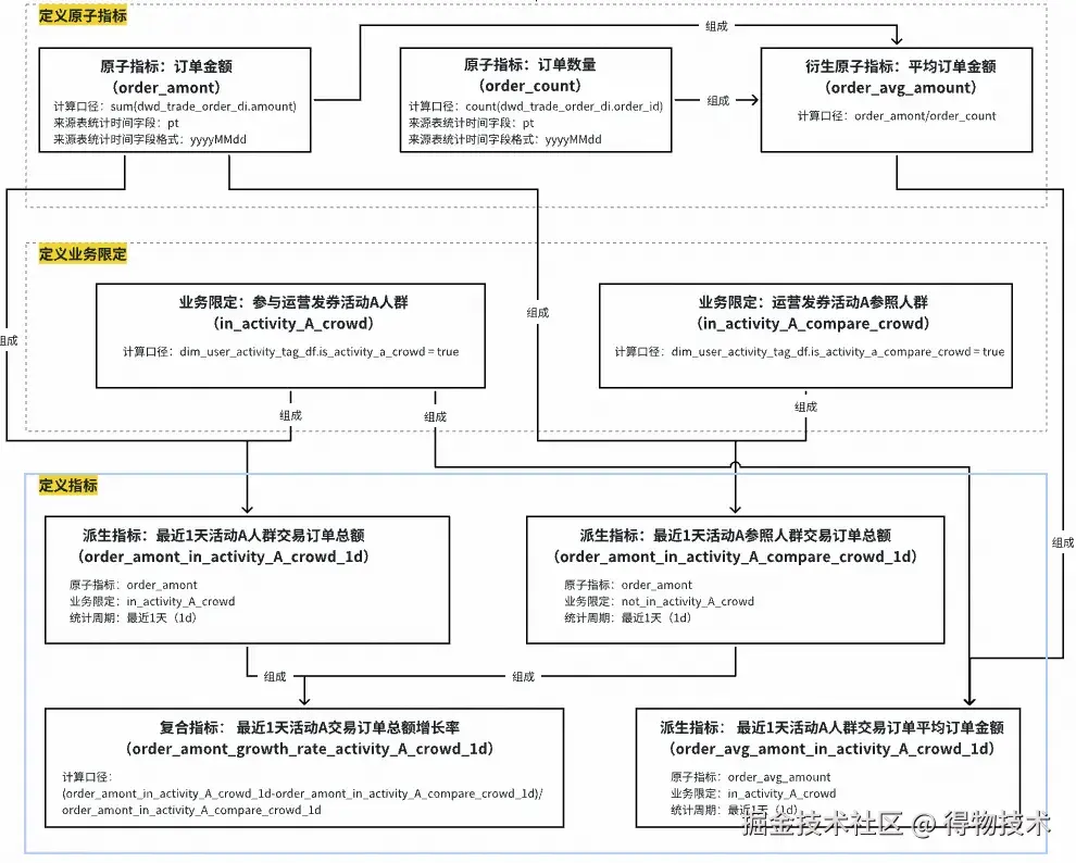其中最为关键部分为"指标建模"。我们将指标的口径组成拆成了三部分组成:原子指标、业务限定、统计周期 ,同时在其物化到表上的时候再确定统计粒度。通过原子要素的组合定义指标可以确保同样的指标在公司全局只会有一个,以及标识出不同的汇总表、应用表中的指标是否为同一个。另外当原子口径发生了变化,系统也可以根据血缘关系找到受影响的指标和表,让owner进行握手确认,确保口径变更一致性。例如下图所示:
