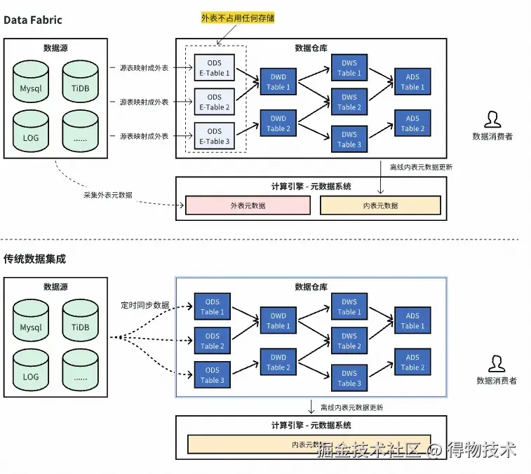 Data Fabric(数据编织)是一种全新的数据集成架构方案,核心理念是 "不移动数据,移动计算 "。 技术实现方案上以外表的形式来封装源端表,通过统一的元数据系统,将源端表(外表)和离线表(内表)统一管理起来,使用起来对用户无感。在执行计算时,通过Spark引擎的跨源联邦查询能力,直接从各源端数据库(一般为备库或抽数库)将数据查询回来后进行分布式计算。下图展示了Data Fabric与传统数据集成的区别: