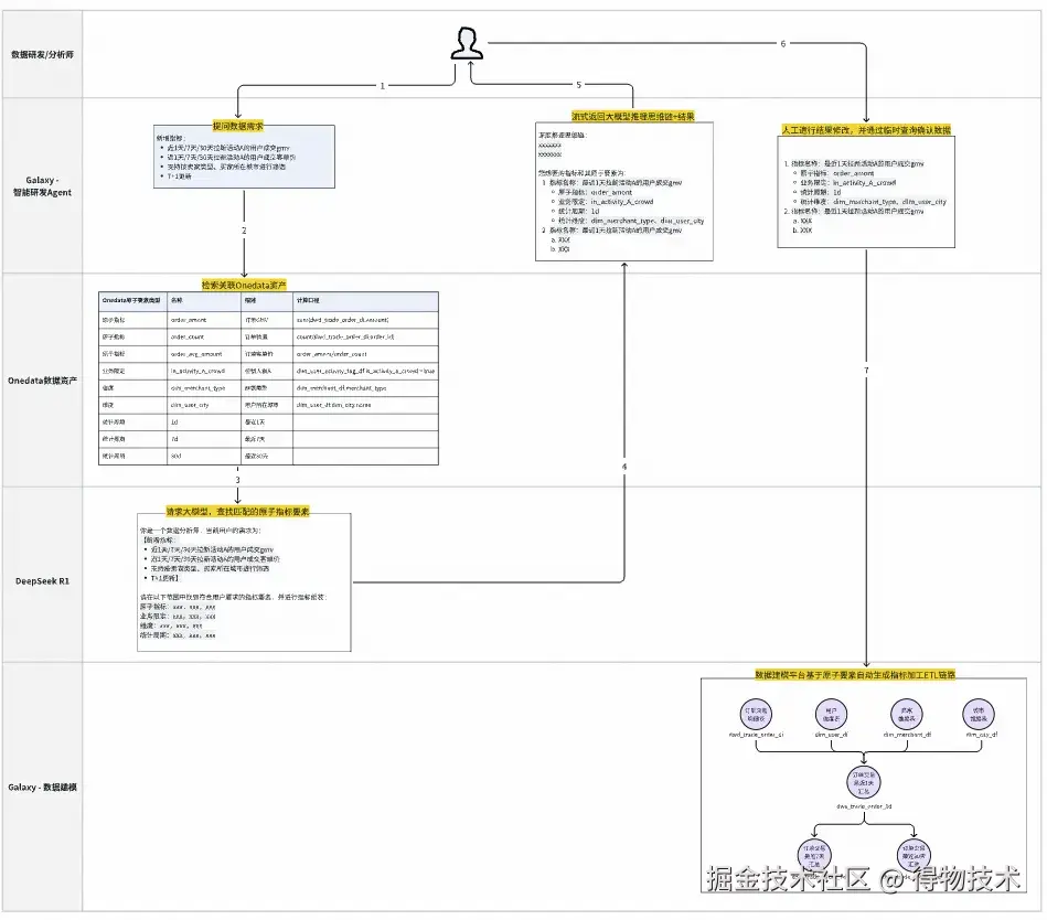 Galaxy的ETL Agent会采用"NL2Metric2SQL "的方案。通过大模型进行自然语言的解析,结合向量数据库的相似度匹配实现NL2Metric的能力,然后基于Onedata数据模型和指标语义层,将自然语言的用数需求 准确翻译为指标原子要素 (原子口径、业务限定、统计周期、统计维度),并自动构建ETL加工链路。如下图案例: