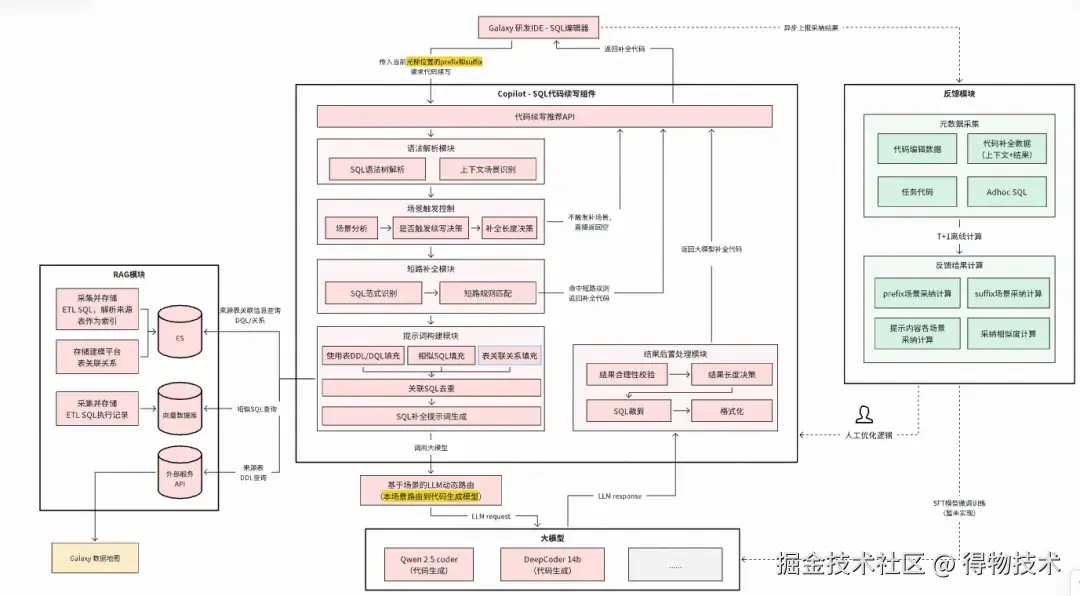SQL代码续写的重点在于工程链路,大模型上我们选择适合代码生成的小参数模型,当前使用了Qwen-2.5-coder,后续会进行其他模型的实验。系统流程如下: