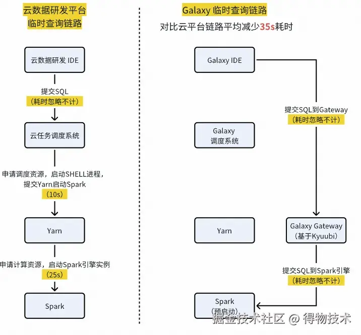 通过简化调用链路+Spark Driver预启动等查询加速技术,平均每个Query可以比原云数据研发平台固定节约35s+。
