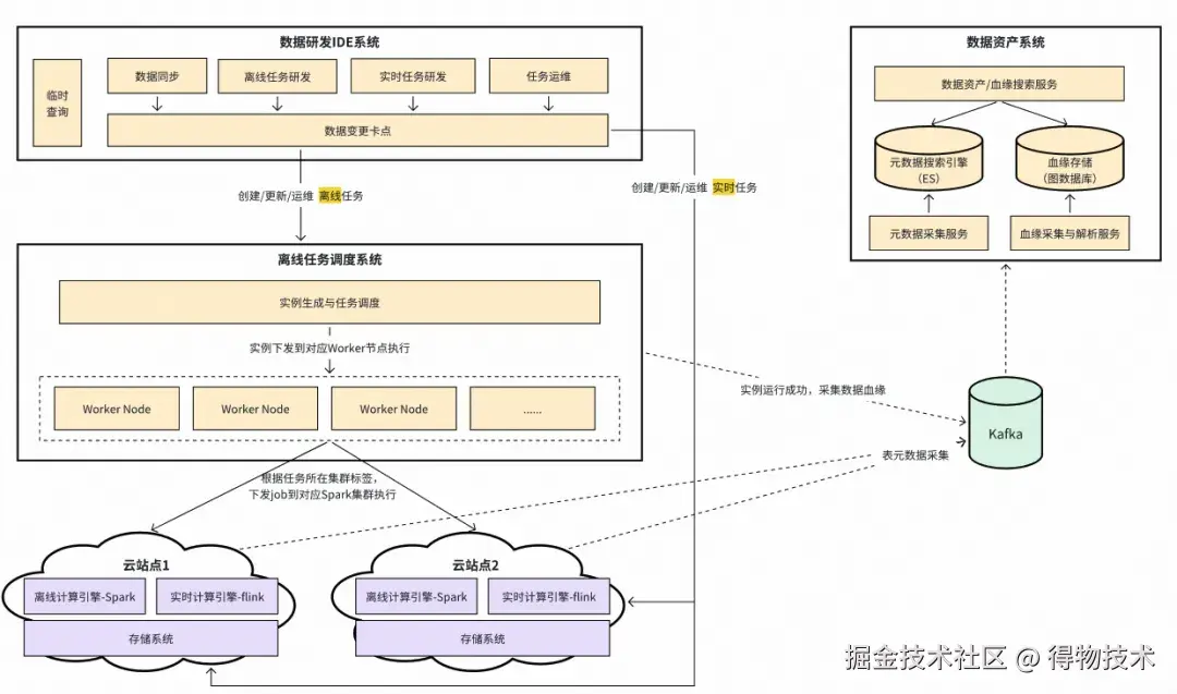 数据研发套件包含数据研发IDE、数据资产系统、离线任务调度系统 三部分,在平台中的定位类似于"汽车的驾驶舱",为数据工程师提供丰富的工具集,控制全公司的数据流动与计算。整体系统架构如下图所示: