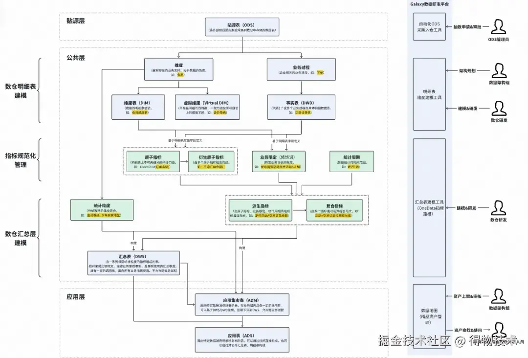 Galaxy数据研发平台基于"Onedata "的数据架构方法论,建立了统一的数据采集和生产规范 ,使数据的新增更加合理、易用,提高数据的复用度、研发效率、交付质量,降低使用成本。这是一种"内啡肽"式的数据建设,前期需要花费一定时间进行数据模型的设计并遵守数据研发规范,但从业务的长远发展来看,这是必须要走的一步。